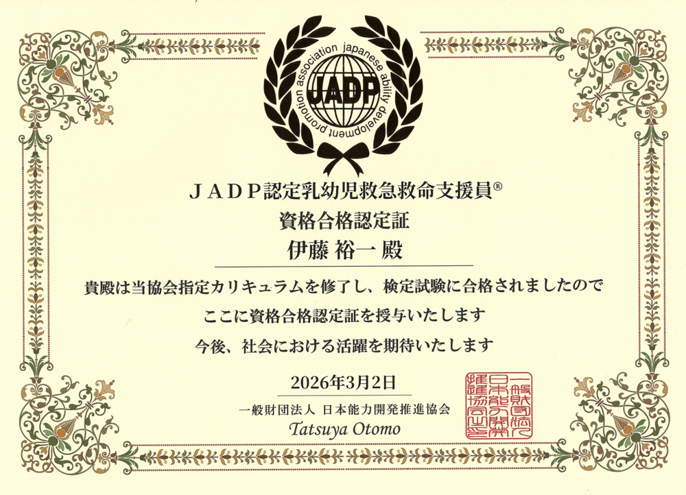 伊藤が乳幼児救急救命指導員の資格を取得しましたので、お知らせします。